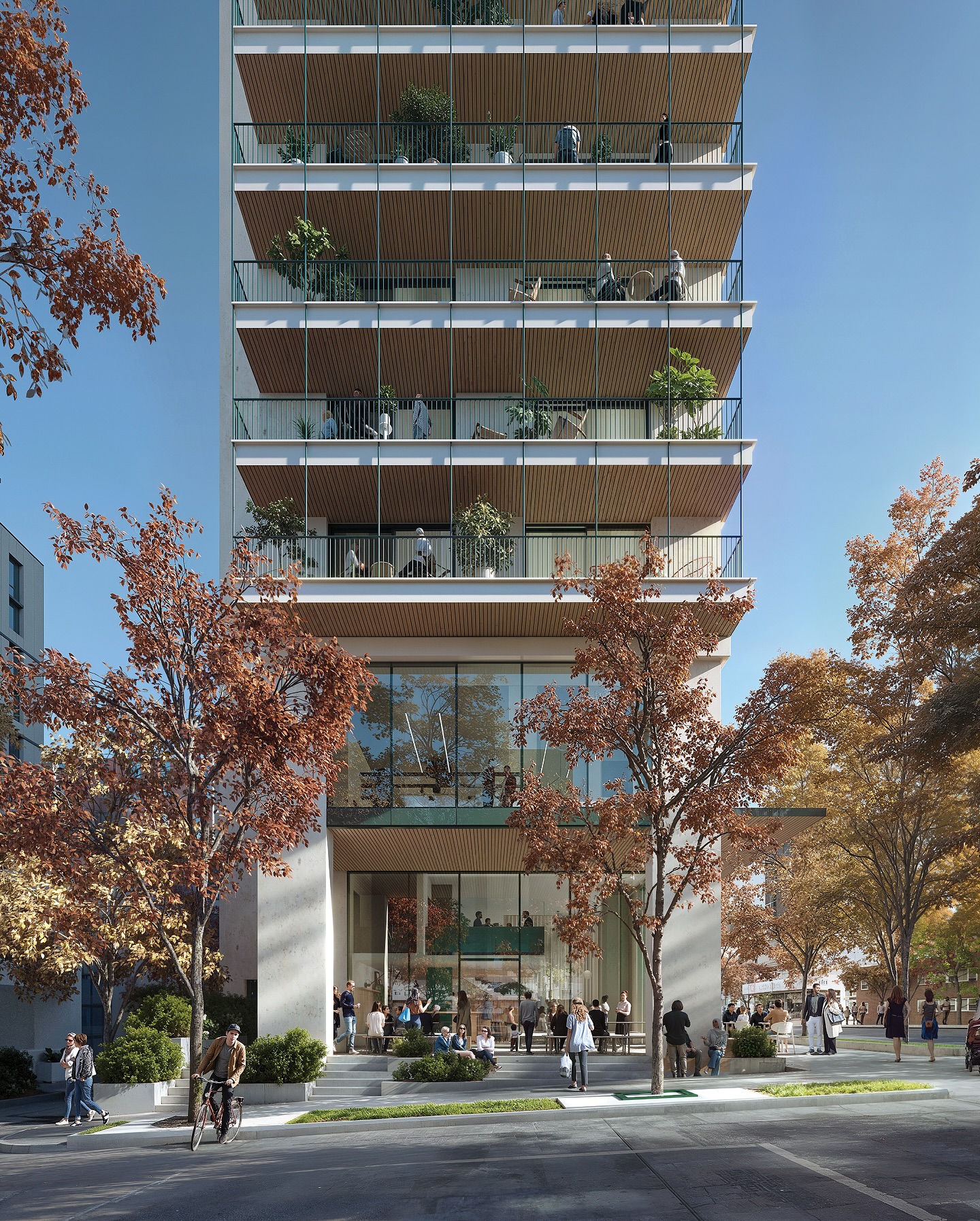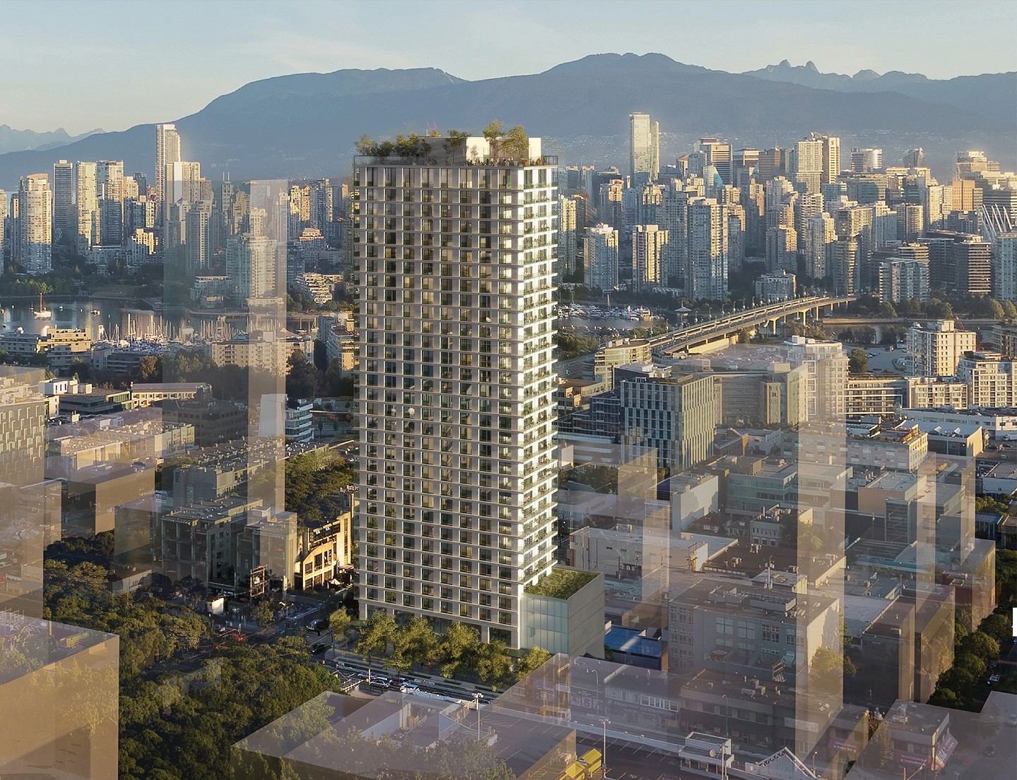 On the Yukon Street frontage, when viewed from the west, the building will have a narrow width of only 50 feet. As an alternative to the conventional tower-podium typology, 365-395 Broadway designs embraces a distinctive tower-pavilion form—transforming a super narrow site into an elegant, context-sensitive design solution.