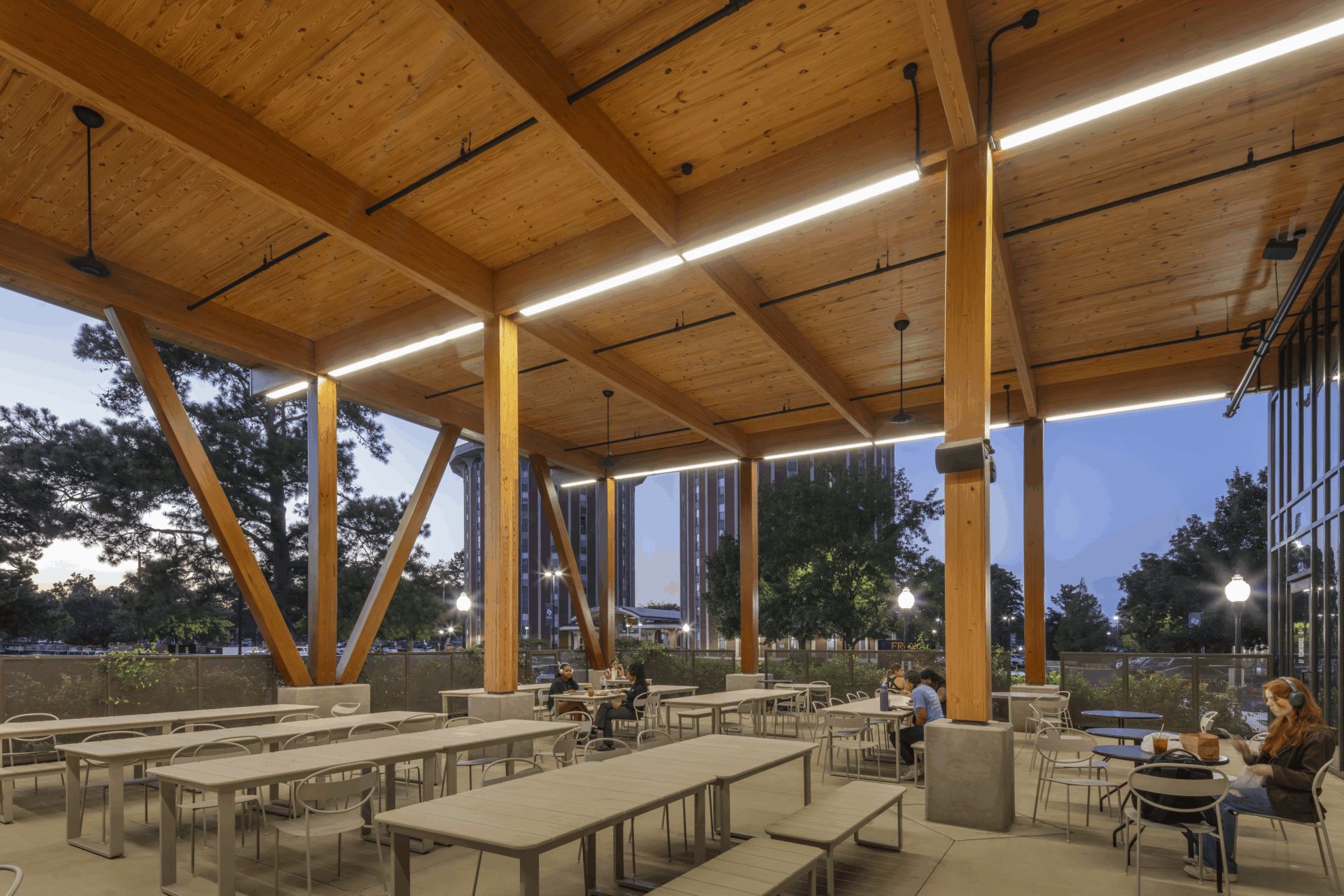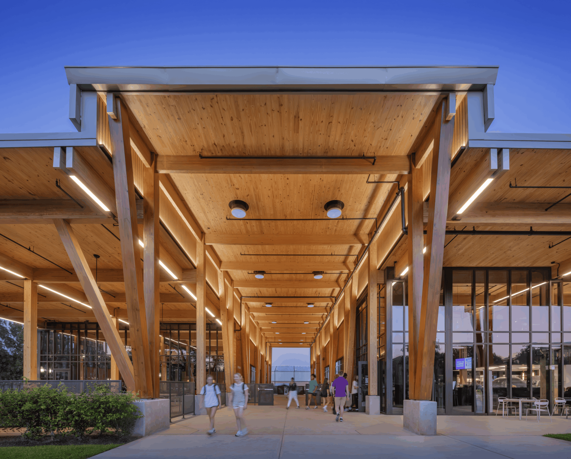 The dining hall and pavilion integrate indoor and outdoor gathering spaces, event areas, and a variety of dining stations within a highly biophilic environment. Exposed timber inside and out strengthens the connection between structure and experience. A covered “paseo” at the main entry serves as an outdoor pedestrian mall, evoking the historic heavy-timber structures that once defined Nacogdoches.