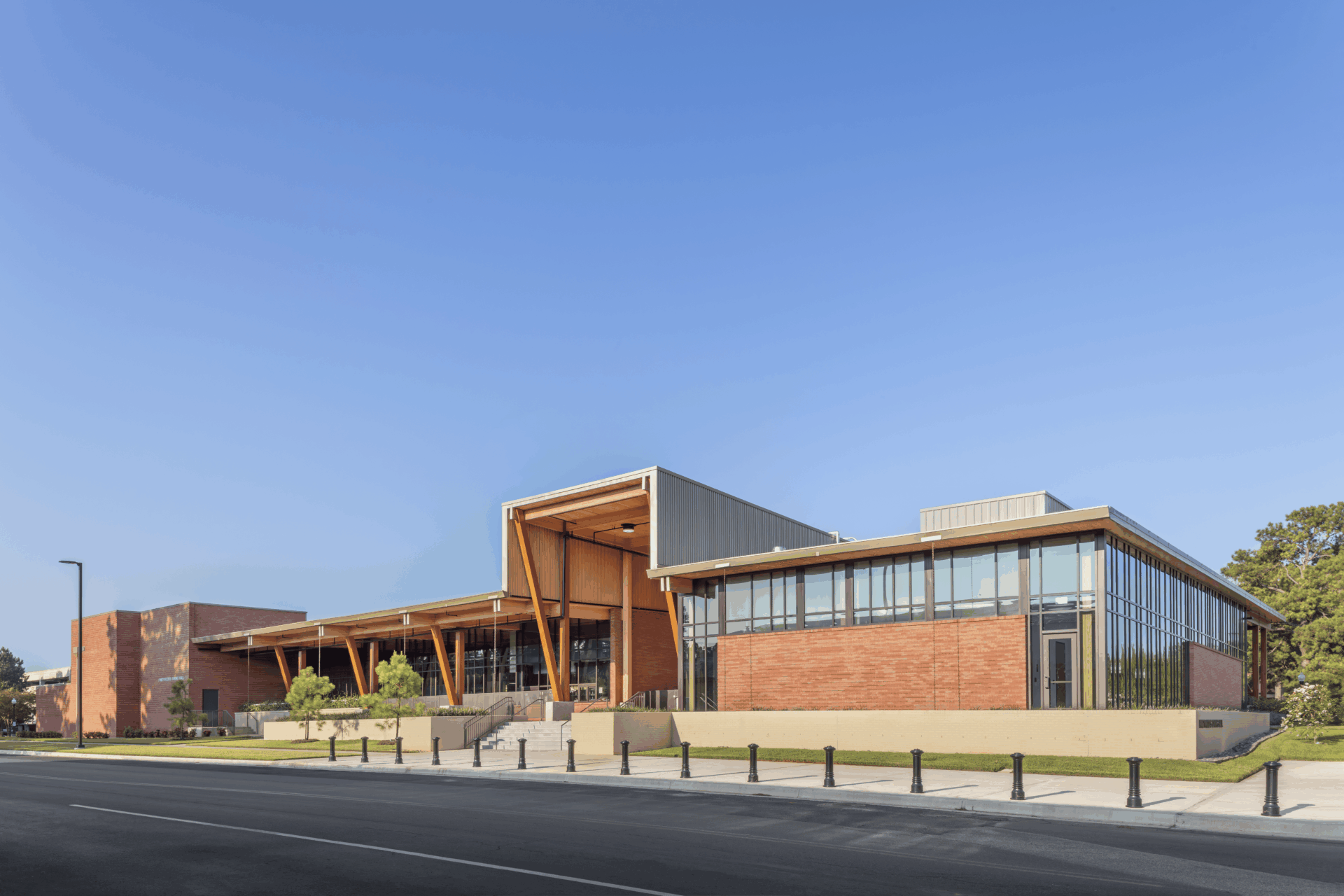 The Pineywoods Dining Hall is a one-story mass timber dining hall on the SFASU campus. As the school’s first mass timber building, the project celebrates the legacy of East Texas forestry through an expressive structural system of southern yellow pine. The building features multiple roof planes, sloping columns, and hybrid glulam–steel braced frames.